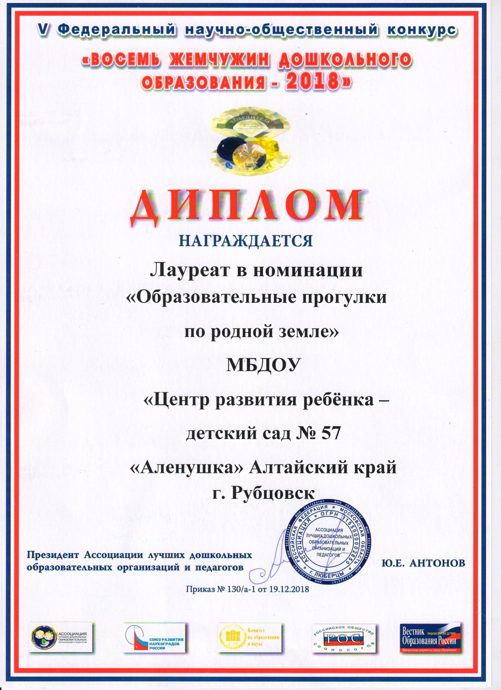 V Федеральный научно-общественный конкурс «Восемь жемчужин дошкольного образования – 2018», который проводился как социальная акция по реализации Плана «Десятилетия Детства» при поддержке журнала «Вестник образования России» и семейного детского телеканала «Радость моя».